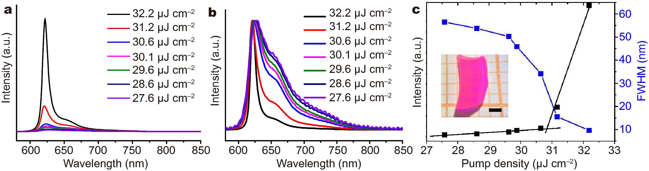 (c)荧光峰强度(黑)和半峰宽(FWHM,蓝)与激光泵源能量密度的关系(插图:SRh@MOOC-1的光学照片,比例尺:1毫米)。