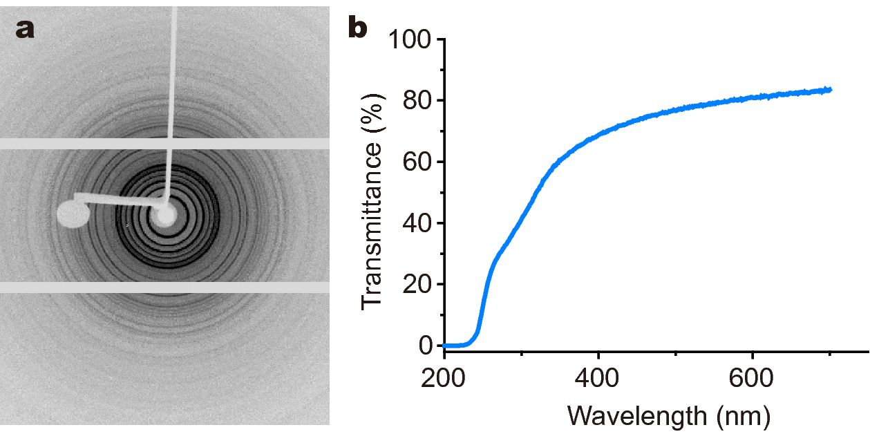 X射线衍射表明,MOOC-1具有环状的MAF-4特征峰,因此是多晶块材而非单晶体或玻璃体。紫外—可见吸收光谱表明,MOOC-1在可见光区的光透过率高达84%。