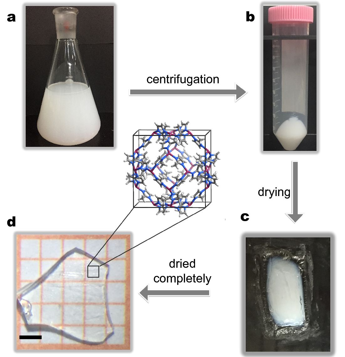 SOD型2-甲基咪唑锌(II),即MAF-4或ZIF-8,是第一例具有天然分子筛拓扑结构和晶体对称性(立方)的MOF,因具有特殊的孔道结构和极高的稳定性而被广泛研究。研究人员以乙醇为溶剂合成了直径约20 nm的MAF-4纳米晶,通过离心分离得到凝胶状样品,再放置在空气中自然干燥,得到无色透明的块体MOOC-1,可见光透过率高达84%。如使用常规加热或真空干燥方法,则得到常见的松散白色粉末。X射线衍射表明,MOOC-1是多晶块材而非单晶体或玻璃体。