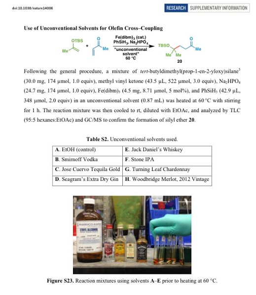 6.用饮料的话怎么能少了酒呢?14年Baran的一篇Nature就以酒做溶剂进行反应,还顺便多筛了几种酒呢。Functionalized olefin cross-coupling to construct carbon–carbon bonds: