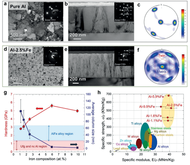 美国普渡大学材料工程学院张星航教授(通讯作者)等人在研究中,得出将少量的Fe(仅少量原子百分比)溶解到Al中,能够在Al(Fe)固溶体中形成具有高密度9R相的纳米孪晶(nt)柱状晶粒。(nt) Al-Fe合金涂层的最大硬度可达到约5.5GPa,是迄今为止最强的二元铝合金之一。 原位单轴压缩表明,含有9R相的钕铝铁合金的流动应力超过1.5 GPa,与高强度钢相当。 分子动力学模拟表明,Al-Fe合金的高强度和硬化能力主要来源于高密度的9R相和纳米级晶粒尺寸。