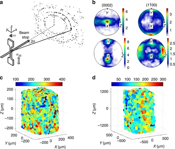 加拿大西安大略大学的Hamidreza Abdolvand (通讯作者)等人通过三维同步加速器X射线衍射研究了原位形变的Zr和Ti多晶体中连续晶粒分解应力的演变过程。研究结果表明,在大部分晶粒中,当拉伸塑性流动超过宏观屈服点后,沿加载轴的应力会随之减小。