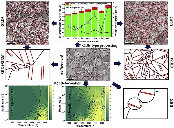 印度理工学院的S.Mandal (通讯作者)等人通过重结晶应变诱发的边界迁移(SIBM)对镍基617合金中的晶界工程(GBE)机制进行了批判性评估。在热加工期间发生动态再结晶(DRX)不会引起显著的多重孪晶,即使在完全DRX之后,也可以形成类似于固溶退火条件下的微观结构。