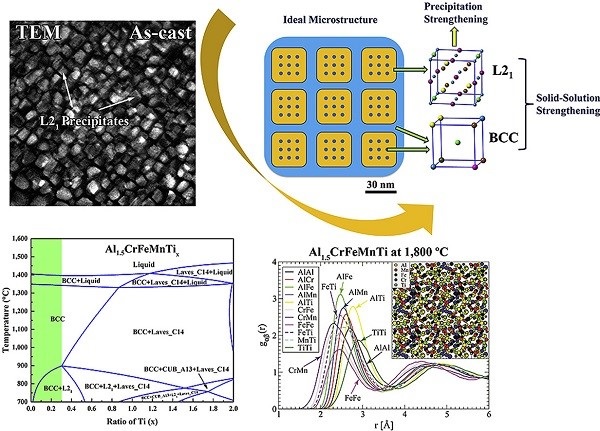 美国国家能源技术实验室Michael C.Gao(通讯作者)和美国田纳西大学材料科学与工程系 Peter K.Liaw(共同通讯作者)通过综合实验研究轻质Al1.5CrFeMnTi HEA的相稳定性和相变行为。在中心温度下观察到L21相在体心立方(BCC)基体中的相干析出。同时,通过研究揭示,可设计出具有较低密度(低于6g / cm3)和较低成本的新型轻质HEA(高熵合金),用于高温应用。