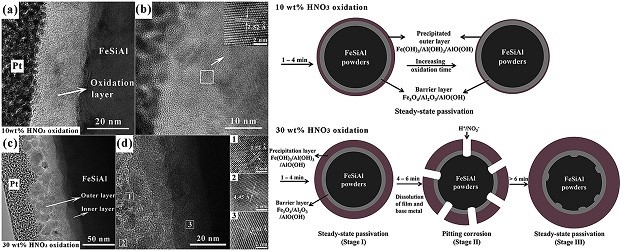 浙江大学严密教授(通讯作者)等人通过系统的实验,研究了不同硝酸浓度下用于制造FeSiAl软磁复合材料(SMC)的绝缘涂层的生长机理,基于点缺陷模型分析了点蚀的起源。在不同生长条件下已经揭示了涂层的演变,并且与SMC的磁性能相关。在综合分析涂层厚度,微观结构和组成的基础上,揭示了涂层的形成和发展机理。此外,HNO3氧化法也可以扩展到其他材料体系,如FeSi、Fe-Co和Fe-Ni基合金。研究所描述的详细的生长机理也可以揭示绝缘涂层的增长及其对各种材料系统的磁性能的影响。
