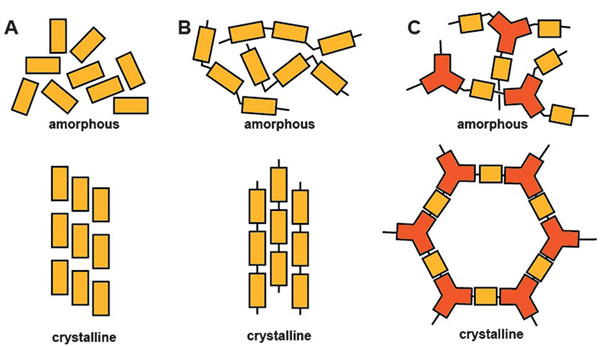 材料能够促进HTH官网地址 进步。例如半导体材料的形成促进了计算机的发展。同时随着HTH官网地址 的发展,通过使用新颖的、高度精密的合成方法,用来调控材料的结构和性能。理论上线性的、网状的和无定形态能够转变成晶体材料。然而这要求无定型态液体、熔体和气体相能够再结晶。但是对于线性和网状的聚合物来讲,随着分子活性的降低,这似乎是一个不可能的任务。因此,通过从溶液或熔体中重结晶来增强长程有序是不可行的。那么如何让有机材料晶体化呢?一种方法是打破无定形的线性聚合物或网格到更小的碎片,并按照长程序重新连接和排序。这是形成有机晶体框架(COF)的先决条件。但是可逆连接功能的要求也是稳定性限制因素。据报道的COF材料(硅酸脂与环硼氧烷)的链接键是可逆的,缺点是在水热环境不稳定。Si-O键具有最高共价单键能为-460kJmol-1。但是在高温水热条件下,无定型态的SiO2能够转变成多晶型晶态SiO2石英。这种方法在工业生产中已经得到了大规模应用。