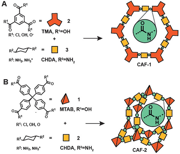 B)由MTAB和CHDA合成3D钻石形的CAF-2示意图。