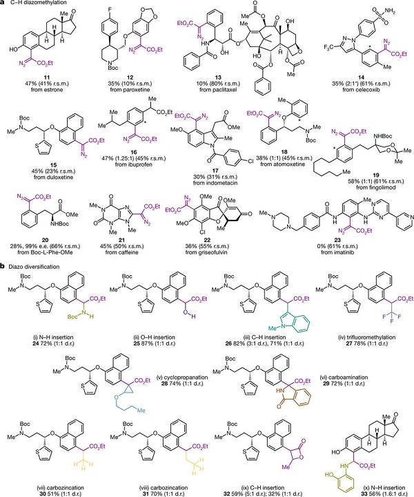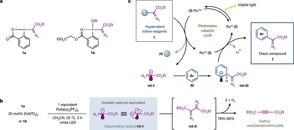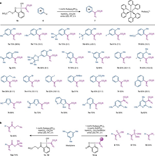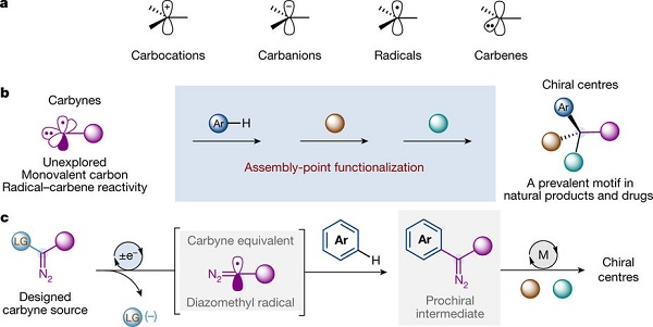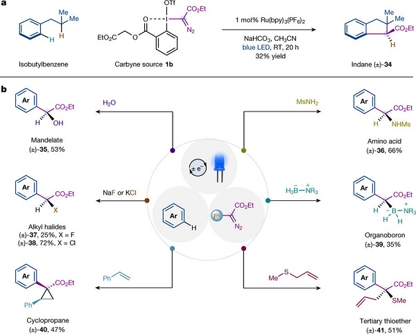 巴塞罗那科学技术研究所Marcos G. Suero(通讯作者)等人意识到碳炔的本征特点是可以连续形成3个新的共价键,猜测产生碳炔或相对稳定的其他碳形式的催化方法可以通过构建手性中心的组装点分离法实现。该研究组设计了一种新的催化方法,利用可见光光氧化还原催化剂,生成重氮基甲基自由基作为碳炔的类似物。这些碳炔类似物可以诱导芳香环上碳-氢键裂的位点选择,产生有效的重氮甲烷甲基化反应,这能稳定医药类化学物后期组装点功能化的排序控制。这种方法为生物活性分子通过调整手性中心的位点提供了有效的路径,也能进行有效后期功能化过程。