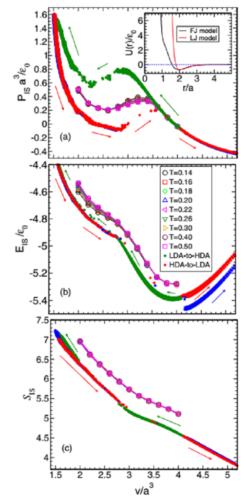 该文章借助ST2水模型发现,可以通过势能面反常特征,以及本征结构能量EIS的凹形区域和在恒定温度下本征结构压力PIS的类范德瓦尔斯环识别出在FJ模型的液液相变和LDA-HDA转变。势能面的两个区域可作如下定义:一个为低密度液相(LDL)和低密度玻璃相(LDA);另一个为高密度液相(HDL)和高密度玻璃相(HDA)。这些区域在势能面上并不是两个可明显区分的深能谷。此外,和ST2水模型相比,FJ液体中的反常现象在远高于液液相变点的温度时仍然存在。