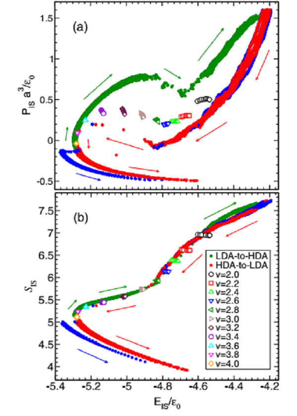 PIS(EIS)和(b) SIS(EIS)在T=0.01,LDA-HDA转变(实心深绿色圆点)和HDA-LDA转变(实心红色和蓝色圆点,蓝色圆点表示两个结晶的轨迹)时的值。平衡态液体相应的值也在图中表示出来(空心符号)。