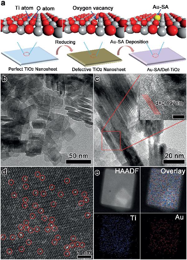 研究人员制备了缺陷TiO2纳米片负载单原子Au位点,其表面具有Ti-Au-Ti三中心结构,不仅可以提升单原子位点Au的稳定性,而且通过降低能量势垒以及缓解Au单原子位点的竞争吸附进而提升催化性能。上述结果在下一代高效单原子催化剂的发展中应用前景广阔。