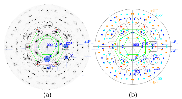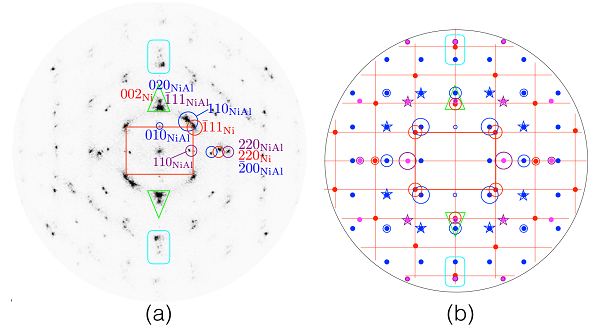 (b)计算得到的Ni-[111]基底衍射图和NiAl-[101]六个取向的叠加。