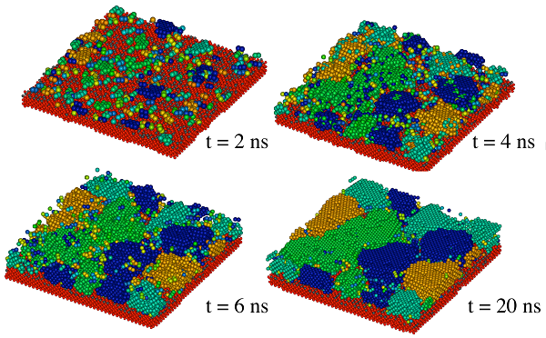 近日,法国勃艮第大学的F.Baras教授在Acta Materialia上发表最新研究成果“Epitaxial growth of the intermetallic compound NiAl on low-index Ni surfaces in Ni/Al reactive multilayer nanofoils”。文章通过分子动力学模拟对Ni-Al焊接片自蔓延反应的晶体生长展开相关研究。以(001)、(101)、(111)这三个低指数的Ni表面为例,探究在Ni的界面出混合和合金化的过程中,NiAl的不均匀外延生长情况。显微结构的演化沿晶粒取向动力学的轨迹进行。在所有的实例中,基于Ni和NiAl单胞之间的关系建立的简单几何构型,来解释晶体生长特征。形核过程和生长动力学均有研究。本项工作证明晶体生长根据Ni的不同取向会产生较大差异。
