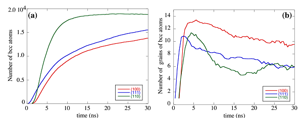 (a)对界面的三个不同取向,在更低界面处bcc原子数量随时间变化情况;