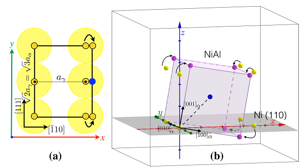 (b)Ni原子相对参考平面发生轻微位移,其上一层的相邻平面处,NiAl单胞置于(110)Ni界面处。