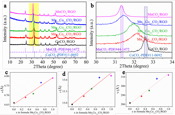 (c-e)MnxCo1-xCO3/RGO(x=0.3,0.5,0.7)、MnCO3/RGO和CoCO3/RGO的晶格参数a、c和晶胞体积V。