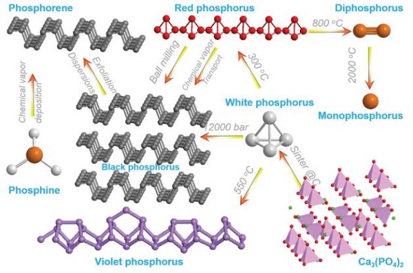 图1 磷元素的同素异形体,以及它们之间转变的化学反应过程