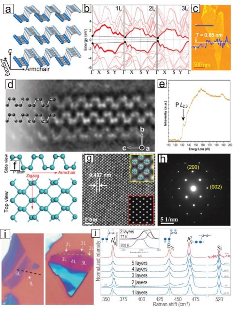 图2 黑磷烯的原子结构、能带、显微图像和光谱表征