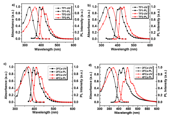 (c,d)xFCz在6×10 -6 M的THF溶液和薄膜中的归一化吸收和PL光谱。