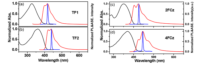 研究人员成功设计并合成了一系列由均相咔唑和二苯胺单元取代三嗪中心与多支链低聚芴(TF1和TF2)组成的单分散大分子星爆。星爆结构抑制结晶趋势,导致非晶形态增强,热稳定性良好。具体而言,基于三嗪中心的新型异质供体 – 受体核心结构在控制所产生的多分枝星爆的电子性质方面起着关键作用,并且赋予分子低LUMO能级,这有利于调节电特性以提高电子注入能力。有趣的是,研究人员发现TFx在稀释时表现出深蓝色的发射溶液和没有明显D-A特征的膜,在这种新型D-A共轭体系中没有观察到明显的分子内电荷/能量转移。F1和TF2有明显的ASE性能,相当低的ASE阈值4.3和10.3 μJ/ cm2。值得注意的是,TF1和TF2表现出增强的ASE稳定性,没有明显的光谱变化,并且随着退火温度在空气中升高到200℃时几乎不变,与线性对应物2FCz和4FCz形成鲜明对比。结果表明,新型分子设计对于提高热稳定性和光学稳定性以及对电特性进行精细调制是有利的,使得产生的多支化三嗪为中心的星爆作为用于电学的有效增益介质泵送OSLs。