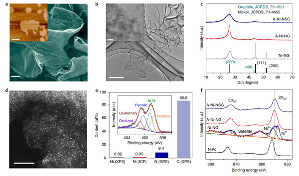 a,单原子镍的SEM和AFM(插图)图像,比例尺:SEM和AFM图像分别为100和500 nm;