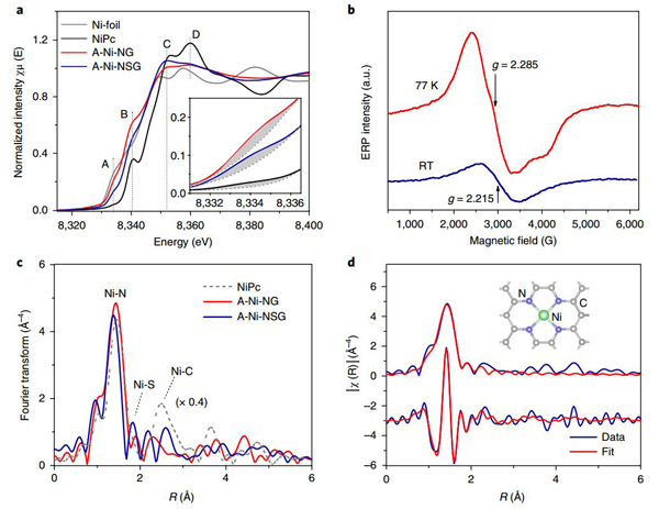 a,Ni-NG,A-Ni-NSG和NiPc的Ni的K-edge XANES光谱,其中A峰代表1s→3d跃迁,B峰代表1s→4pz跃迁,C和D代表1s→4px,y跃迁和多重散射过程(插图展示了扩展的前缘区域;灰色阴影区域表示1s→3d过渡的强度)。催化剂是分散在Kapton(聚酰亚胺)胶带上进行荧光XAS测量;