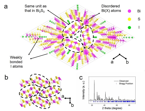 a-b: Bi13S18I2相对于Bi2S3结构,虚线圆表示来自Bi2S3的Bi13S18I2中的遗传片段;