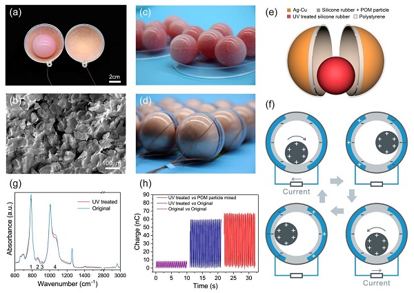 a, c,d) 球壳结构TENG单元、硅胶球及外壳的照片;