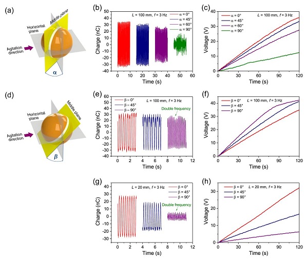 b, e, g) 不同姿态下的TENG 单元的转移电荷量;
