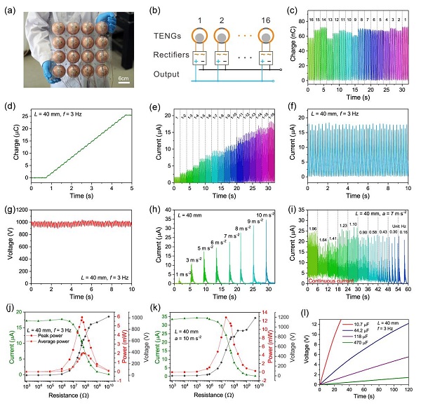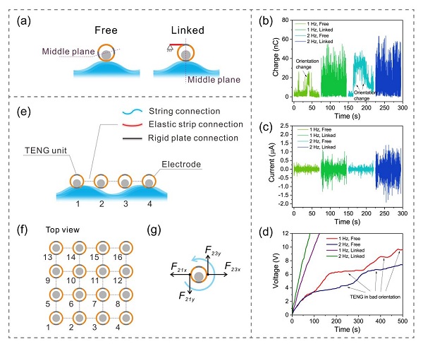 c-g) 在40毫米幅值及3赫兹频率的简谐激励下,TENG阵列的输出,其中c)为阵列中每一个TENG单元的转移电荷量,e)为不同单元数量下的整流短路电流输出,d, f, g) 为整流情况下,整个阵列的电荷、短路电流及开路电压输出,c)和e)中标注了相应的单元编号;