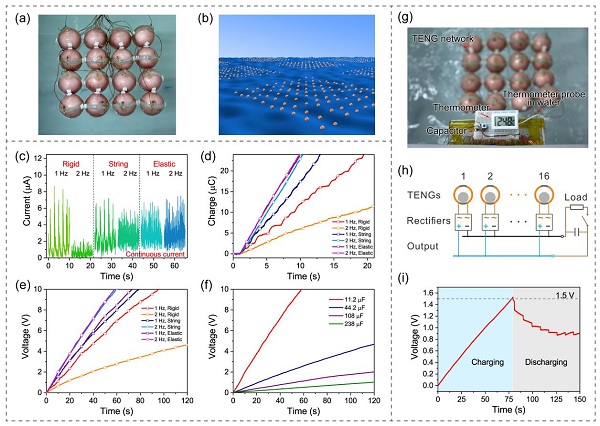 近日,中国科学院北京纳米能源与系统研究所王中林院士课题组首次成功实现了耦合摩擦纳米发电机网络对波浪能的收集,通过网格式TENG网络中各单元的耦合作用,大幅度提升了TENG在真实波浪环境中的工作效能。研究组首先基于紫外改性及掺混微颗粒的硅胶材料构建了高性能TENG单元,实现了电荷量的大幅提升、对微小机械扰动的灵敏响应及良好的耐久性。在低频正弦激励下,单个TENG单元的峰值功率可达1.28毫瓦,平均功率为0.3毫瓦。在单元优化的基础上,构建了4×4排列的16个球形TENG的阵列,整流的单次输出电荷量达2.14微库,在低频激励下可输出5.93毫瓦的峰值功率和2.04毫瓦的平均功率。通过真实波浪环境实验,阐明了网络连接对于提升TENG单元效能的重要作用,提出了三种单元连接策略并构建了相应的网络,其中柔性连接结构显示出更好的效果,相比于未连接的分散单元状态,柔性连接网络的电荷量输出可为未连接的10倍以上。最后,采用耦合TENG网络在水波驱动下为温度计供电,成功采集了水体的温度,证实了其应用于海洋监测仪器供电等领域的潜力。此项研究展示了摩擦纳米发电机网络可作为波浪能收集的一种新颖有效的技术方案,同时也提出了高效的网络连接策略,将可用于向更大规模的单元系统扩展,形成TENG模块和大型网络,为大范围收集海洋波浪能提供了可行的实验方案。相关成果以“Coupled Triboelectric Nanogenerator Networks for Efficient Water Wave Energy Harvesting”为题发表在ACS Nano上。