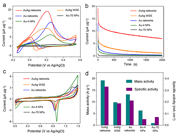 图4. AuAg纳米超结构在甲醇的电催化氧化中的性能。图片源自Nature Communications