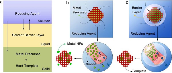 近日,西安交通大学方吉祥教授科研团队通过一种‘软包裹’的方案,利用分子筛为模板获得了多种组分、高纯、单分散的高质量贵金属纳米结构,成功的解决了贵金属纳米铸造过程中,产物向介孔模板外扩散这一长期的技术难题。如图1所示,当金属前驱体离子在分子筛模板内被还原剂还原成原子的过程中,金属原子或离子常常会扩散迁移到模板外面,形成在模板外面的生长,而如果将预先填充有金属前驱体的分子筛模板进入到一种有机溶剂中,金属前驱体不能溶解进入该溶剂而还原剂分子可以穿过该溶剂进入分子筛中,将分子筛中的金属离子还原成原子并生长成纳米晶。