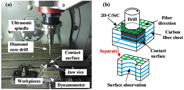 来自清华大学的冯平法教授(通讯作者)在Composites Part B: Engineering上发表了一篇题为“Effects of tool vibration on fiber fracture in rotary ultrasonic machining of C/SiC ceramic matrix composites”的文章。作者对2D-C/SiC复合材料进行了多次旋转超声波加工(RUM)实验。分析了不同纤维方向,超声振幅和主轴转速下微孔表面的微观结构特征。结果表明,纤维的切割方向和切削速度都明显影响C / SiC复合材料的RUM表面形貌。工具超声振动可以通过纤维断裂机理的改变,提高C/SiC复合材料的RUM孔表面质量。