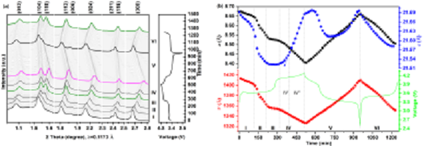 图2 基于同步辐射的原位XRD:谱图和晶胞参数变化都能看出常温循环时结构的不可逆变化