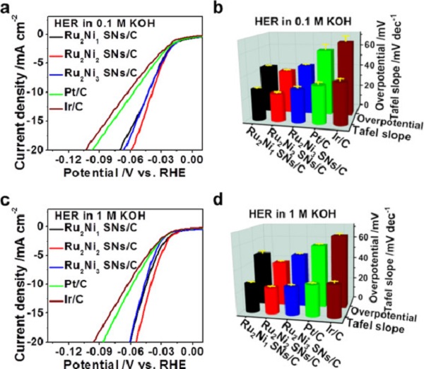 (a) Ru-Ni SNs/C, Pt/C,Ir/C在0.1M KOH溶液中的HER极化曲线;