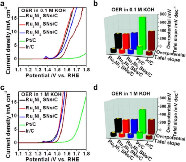 (a) Ru-Ni SNs/C, Pt/C, Ir/C在0.1M KOH溶液中的OER极化曲线;