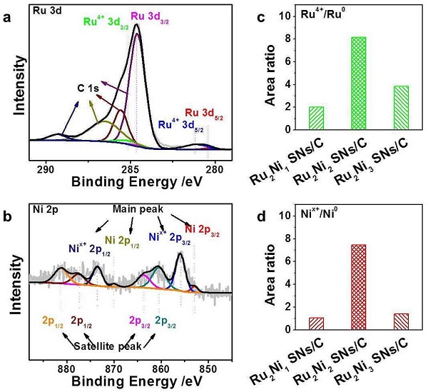 XPS图的元素面积比:(c) Ru4+/Ru0;(d) Nix+/Ni0;