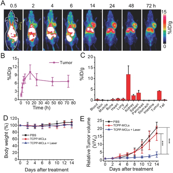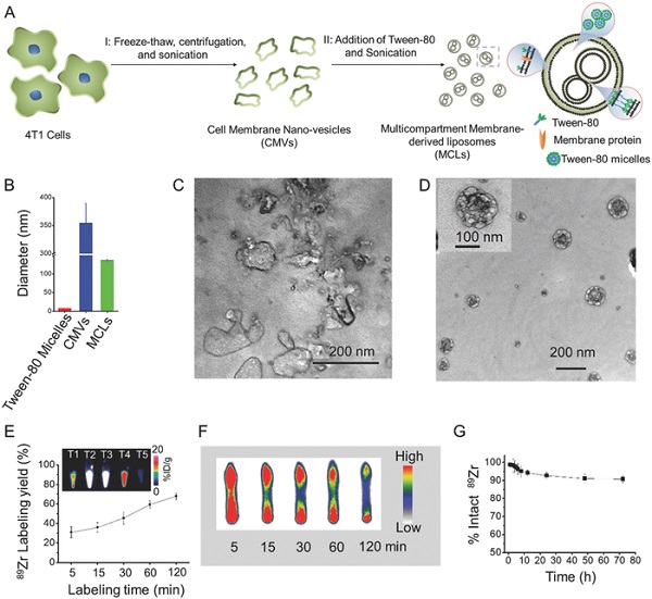 这个工作设计了一种以细胞膜重组装的方法来构建多室脂质体。多室脂质体与p-SCN-deferoxamine连接,通过后者的螯合作用,构建了89Zr-Df-MCLs。89Zr-Df-MCL表现出了卓越的放射化学稳定性、更好的肿瘤渗透性和滞留效果;在保持长期且有效的光动力学治疗效果同时,也能通过肝脏排泄从体内清除。此工作为后续的癌症纳米诊疗工作提供了一种新的思路。