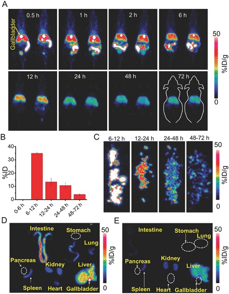 (A)89Zr-Df-MCLs静脉注射小鼠体内PET成像(0.5, 1, 2, 5, 12, 24, 48和72小时)