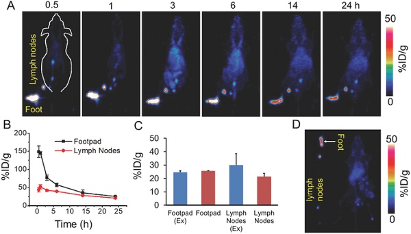 (D)足下注射24小时后,淋巴结和小鼠的体外PET成像