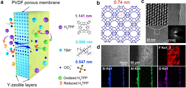 (a)显示Y-PVDF离子选择性膜的离子选择性原理的示意图;