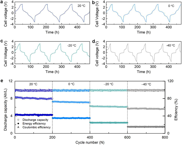 (a-d)分别在不同温度 (20, 0,−20, and −40℃),1mA/cm2的恒定电流密度下的充电/放电行为;