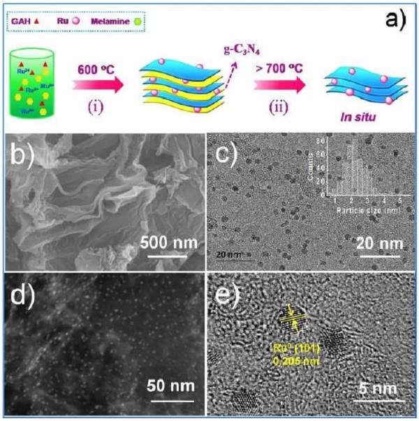 得益于出色的热稳定性、表面化学特性的可控性以及耐酸碱腐蚀性,炭材料在电化学领域得到了广泛的应用。贵金属基复合材料的最新进展主要集中在负载型的电催化剂,比如Pt-Pd-石墨烯, Pt-CNSs/RGO, Pd-CNs, Pt/Ni@NGNTs。这些复合材料一方面降低了金属前驱体的用量,另一方面也提升了材料的耐受性。但是,制备过程却很复杂,并且金属前驱体的还原通常需要过量的还原剂(e.g. NaBH4)。此外,负载在基底材料表面的金属纳米粒子存在纳米颗粒与基底接触不紧密的问题。因此,发展一种简单、有效的方法来增强金属纳米颗粒与纳米炭材料的接触,从而抑制纳米金属在使用过程中的流失具有重要的意义。金属与碳基质通过热解过程原位合成可能是一种可行的方案。然而,金属粒子尺寸在高温热解过程中很难控制。相对较大的粒子尺寸和差的分散性会降低催化剂的催化活性。通过经济途径,将均匀分散的金属纳米颗粒牢牢地束缚在炭纳米材料上仍然是一个挑战。Ru是一种具有经济优势的,价格大约是Pt的1/15的金属。并且,Ru具有与氢相似的键强度(~65 kcal mol-1),然而关于其催化HER的研究还较少。