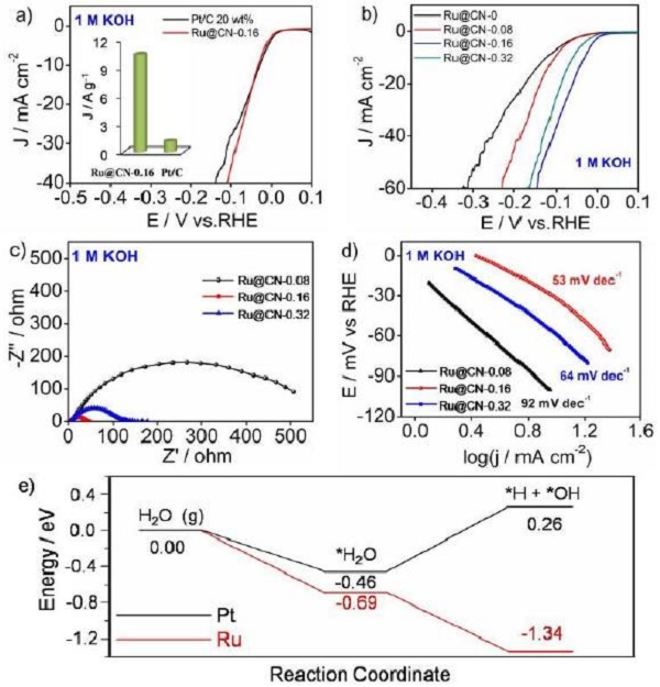 a) Ru@CN-0.16、Pt/C在1 M KOH溶液中的极化曲线,插图为Ru@CN-0.16和Pt/C的质量活性;.