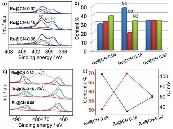 b) Ru@CN三种氮的成分(N1:石墨季氮, N2: 吡咯氮, N3: 吡啶氮) ;