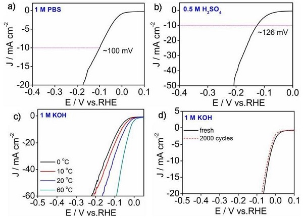 近日,来自浙江大学的王勇教授等人在Energy & Environmental Science上发文,题为:“Highly uniform Ru nanoparticles over N-doped carbon: pH and temperature-universal hydrogen release from water reduction”研究人员制备了一种高度均一的Ru纳米颗粒负载于氮掺杂的炭材料表面,研究发现在一个较宽的pH及温度范围内该催化剂具有出色的HER性能。特别是在碱性溶液中,在10 mA cm-2的电流密度下过电位为32 mV,而且质量活性超过了商业Pt/C。同时Ru@CN-0.16在0 ℃到60 ℃温度下均展现了出色的性能,这为工业化电解水提供了可能。