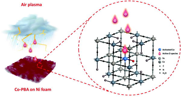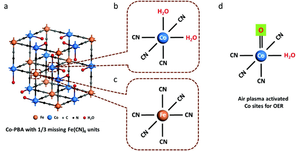缺少Fe(CN)6单元的Co基普鲁士蓝类似物经过低温空气等离子体处理后,形成高活性和稳定的基于框架的OER催化剂。等离子体中产生的活性氧物质与Co的开放位点键合,并促进Co到Co(III)的氧化态转变。由于纳米多孔骨架中具有高度活性和分布的金属催化位点,OER催化剂在100 mA cm-2的高电流密度下具有仅为330 mV的低过电位特性,这接近于工业碱性物质的实际操作条件电解槽。高度化学反应性,低热效应和弱离子轰击的组合使得低温空气等离子体成为开发高性能催化剂的非常有前途的技术。