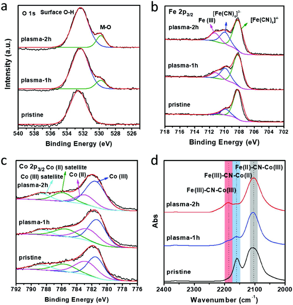 c)原始和等离子体处理的Co-PBA的Co 2p3/2 XPS光谱;