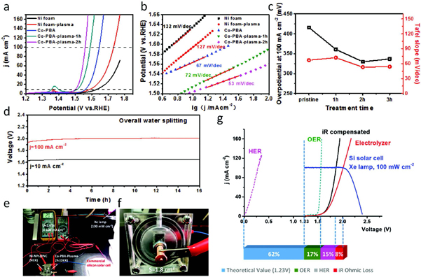 d-g)等离子体处理2小时的Co-PBA样品在水电解中的OER性能;